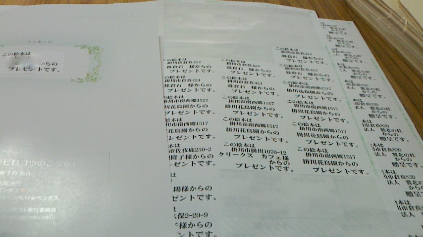 掛川花鳥園様、掛川駅前びさいどう本屋様、きほくのもり★ペンタスなどで予定しています。 - 3月 寄附者の御名前を裏表紙に貼って、各園へ宅配する準備をしています。