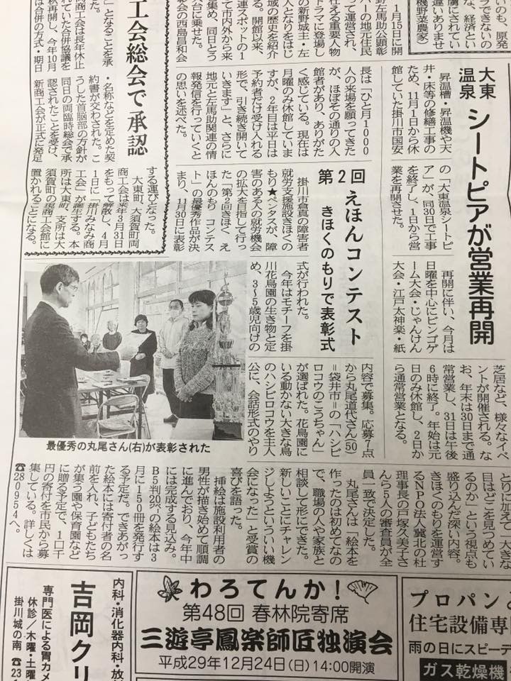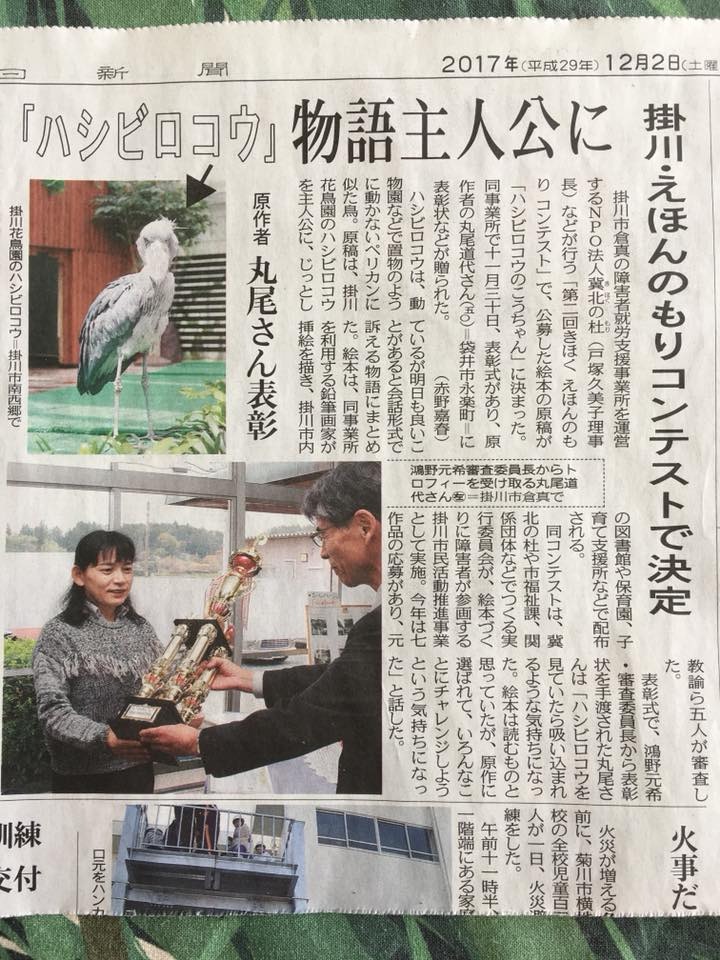 お陰様で今年も2月下旬には製本されます。第2回きほく えほんのもり コンテストで最優秀賞を受賞された「ハシビロコウのこうちゃん」の原稿に、障害者就労事業所の利用者が、只今一生懸命挿絵を制作しているところです。