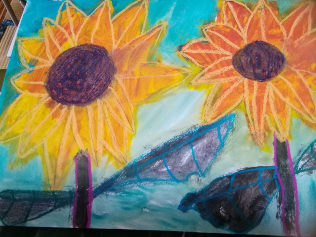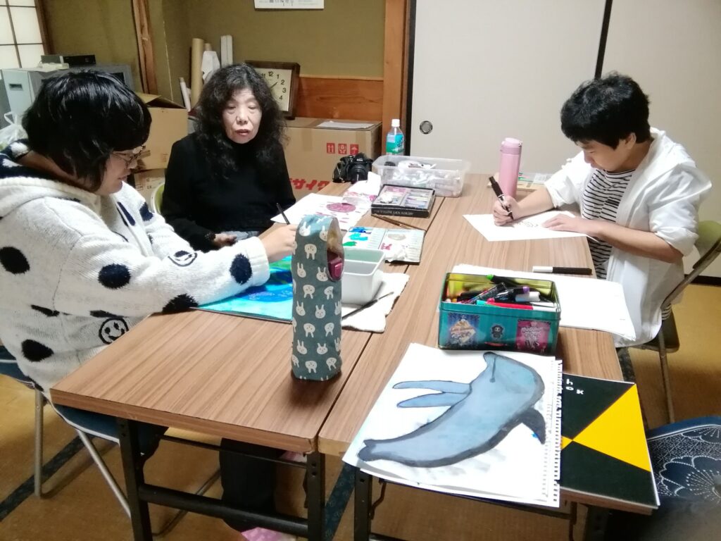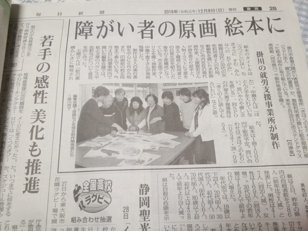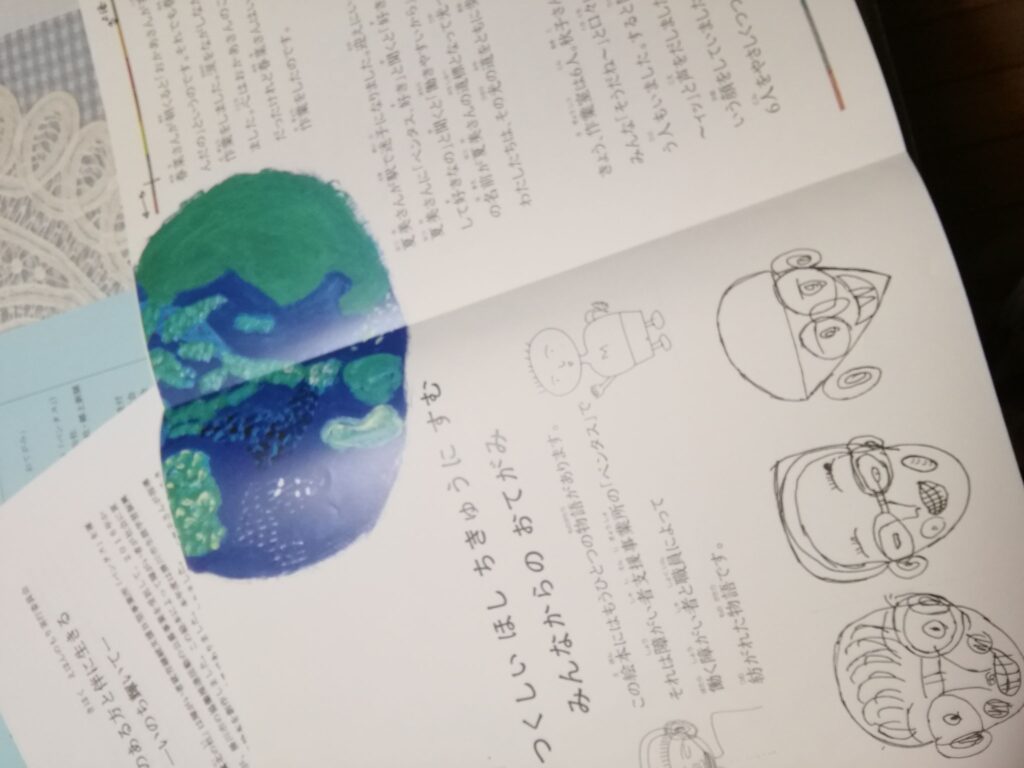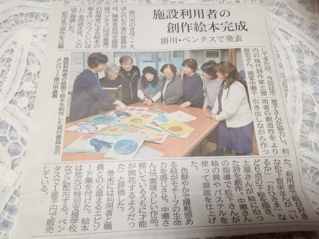 土屋智宏氏から贈られた現代詩に、中瀬千恵子氏から美術指導を賜った障がい者の松下智栄さん、木村友美さんが挿絵を描いた。